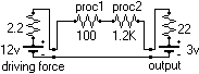 Note the driving force minus the back pressure is 9 volts. The total resistance is 2.2 + 100 + 1200 + 22, or 1324.2. Among the resistors, proc2 is the bottleneck. A change to any other resistor would be insignificant. The only resistor that could double the output current is proc2.