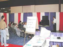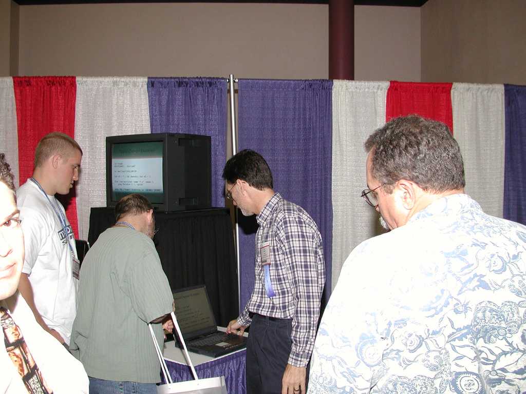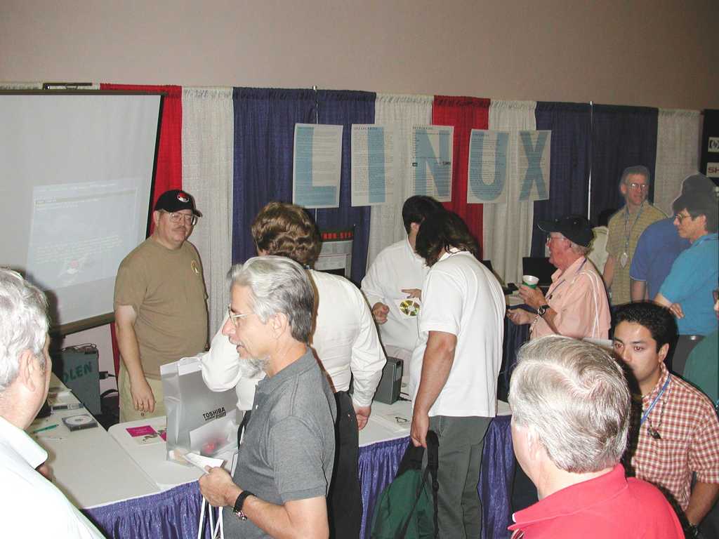 While all this speaking was going on, Brian Ashe, Mark Alexander, Tom Foster, David Lokietz, Phil Barnett, Hale Pringle, Jon Day, Brian Coyle, and several others were manning the booth and introducing hundreds to Linux. The action was constant. Brian Ashe designed the booth, and it was beautiful. Sort of a G shaped affair, 20 feet long and 10 deep, there was a wide gap where attendees could easily come inside the booth, and yet there was isle adjacent space to give freebies to those too hurried to "stop on in". Attendees tended to congregate in the isle while talking to the LEAP volunteers, but because of the wide isle and the absence of a booth on the other side, this worked out.
